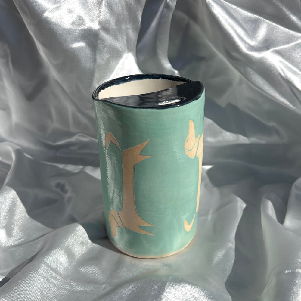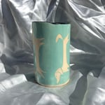 Hand built stoneware aqua/black ceramic travel mug with retro dachshunds stenciled design