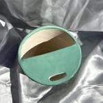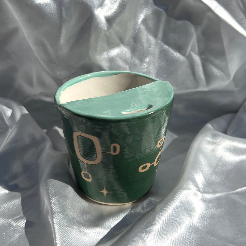 Hand built stoneware aqua/dark green ceramic travel mug with retro stenciled design