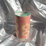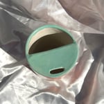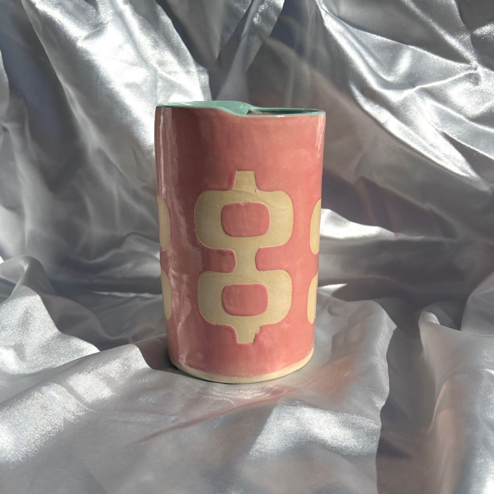 Hand built stoneware aqua/pink ceramic travel mug with retro stenciled design