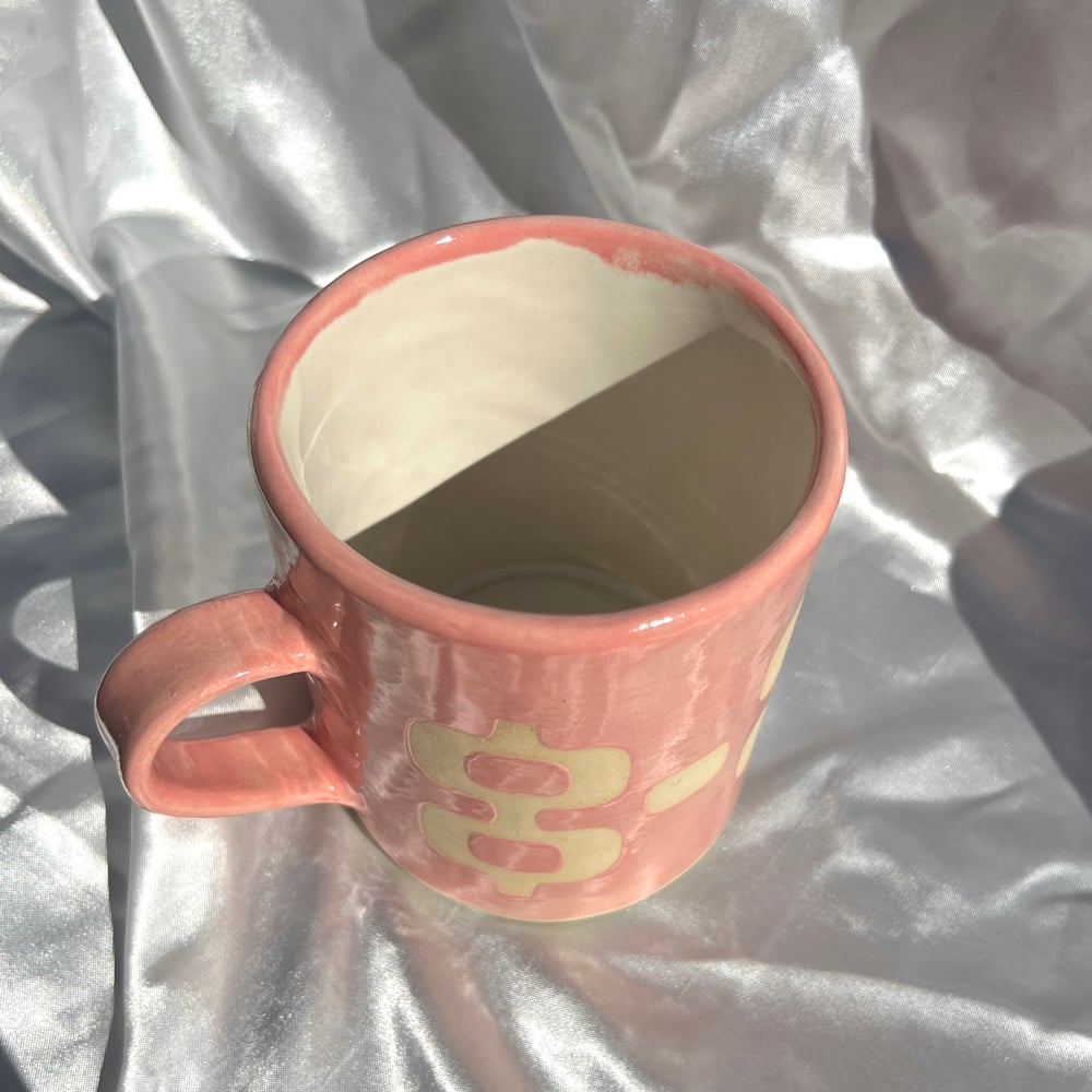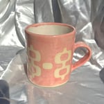 Hand built stoneware pink ceramic mug with retro stenciled design