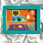 Original gouache painting featuring a retro Halloween room scene of a cat on a couch