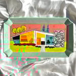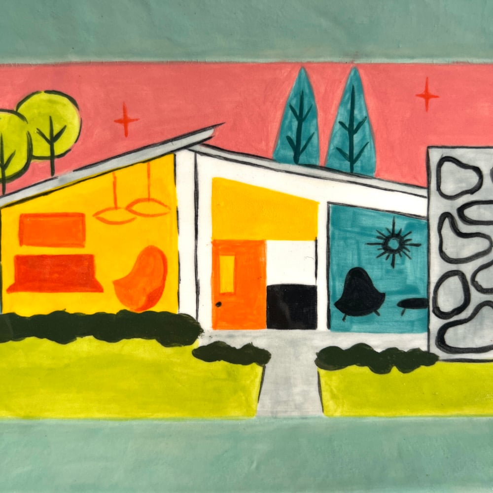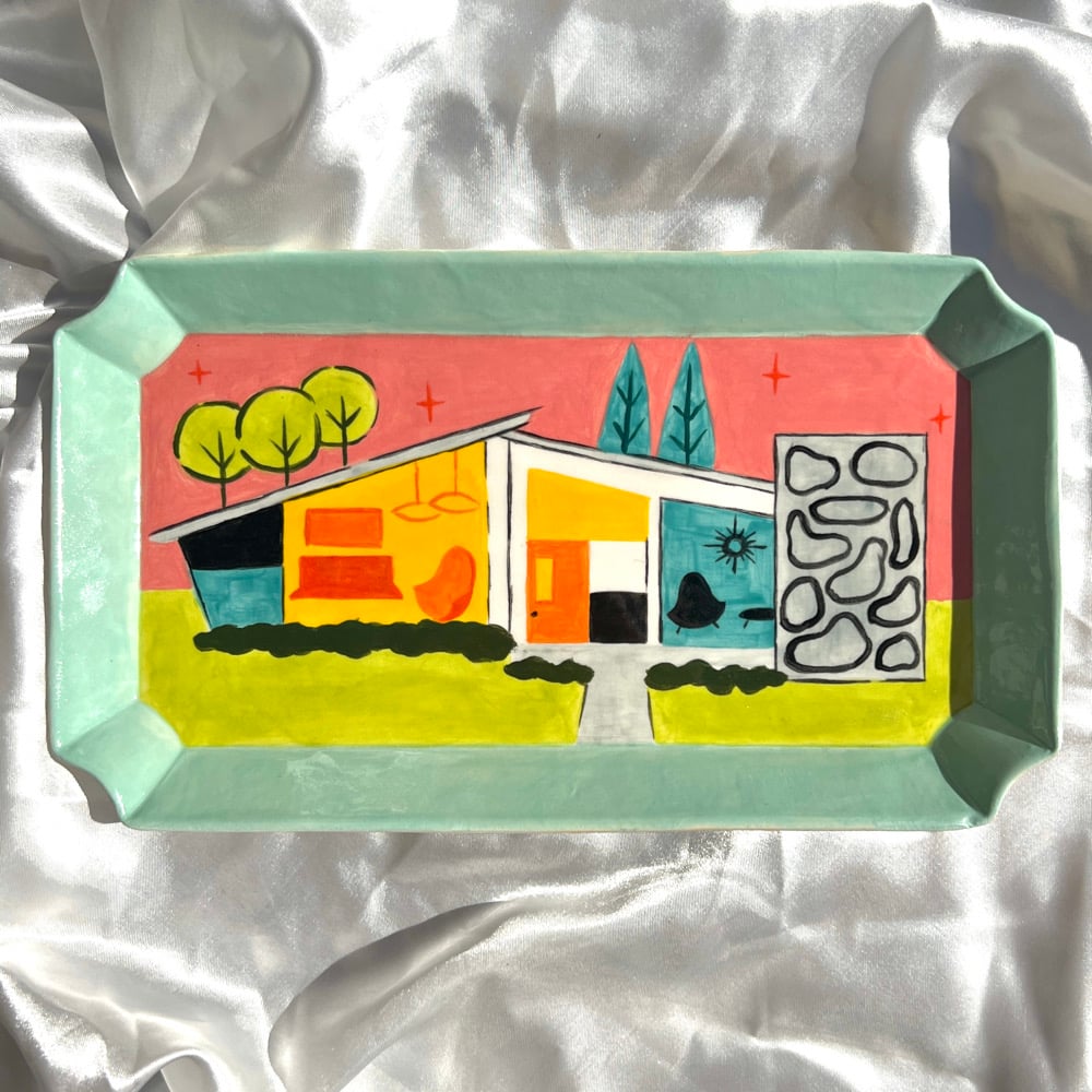 Stoneware ceramic plate featuring a colorful retro '50s style house